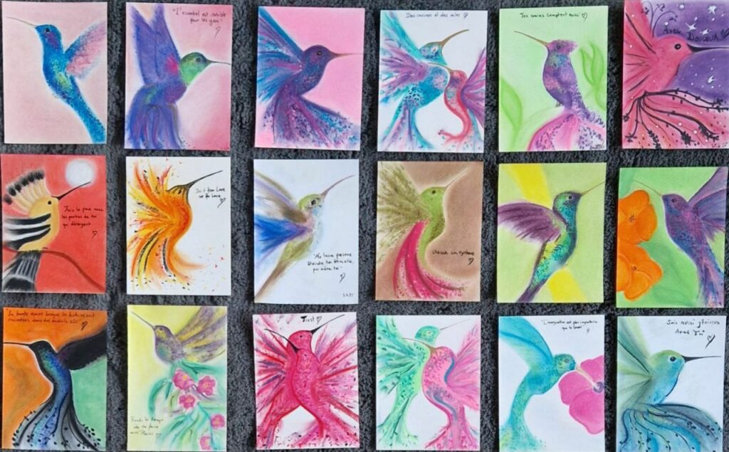Je dessinais ces colibris pour le plaisir, pour revenir dans l’instant et calmer mon mental… A présent, je les partage avec vous.